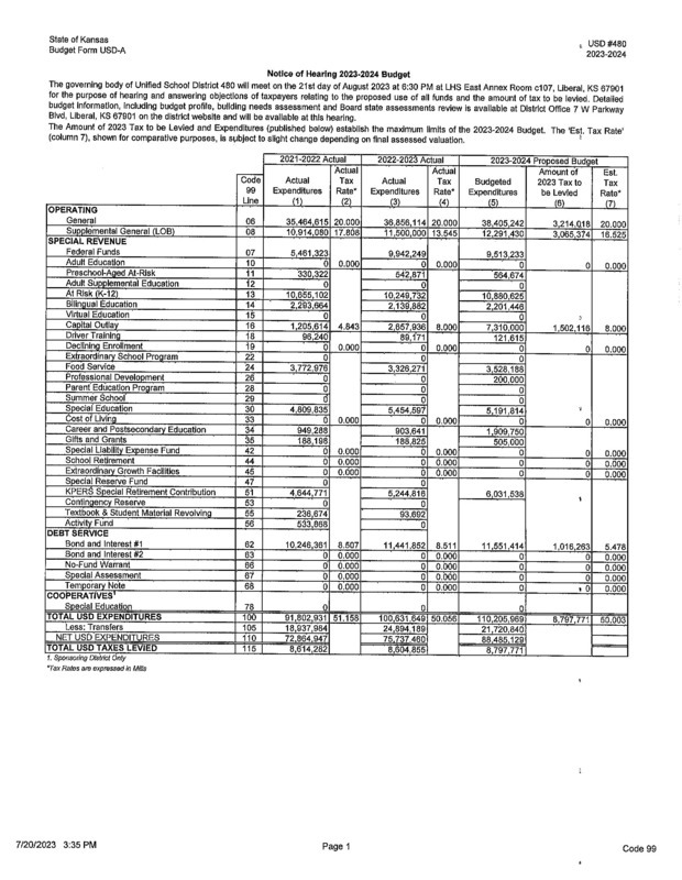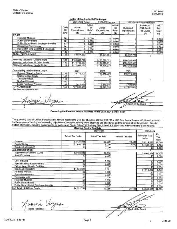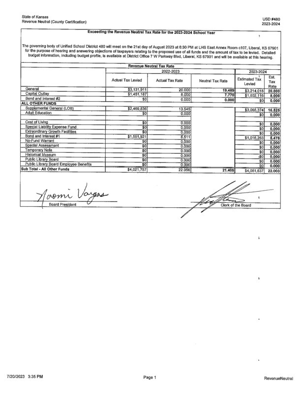 The USD 480 Board of Education will be discussing the 2023 Revenue Neutral Tax Rate Resolution at the Monday, August 21 board meeting. Resolution 08-21-2023, in accordance with SB 13, would authorize USD 480 to exceed the revenue neutral rate for the 2023-2024 budget. The Revenue Neutral Rate and Budget Hearing will be at 6:30 p.m. in Room C107 of LHS East Campus.