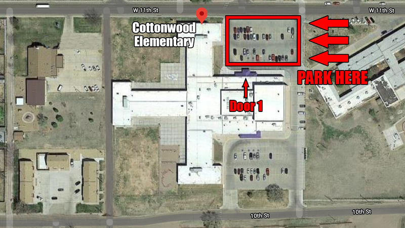 It is recommended that those attending park in the lot on the North side of Cottonwood Elementary just South of Eleventh Street and use the main entrance (door 1). The commons is just past the double doors at the main entrance.