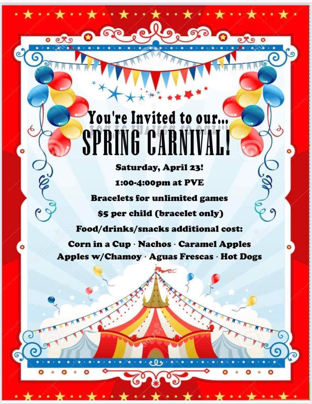 PVE Booster Club is hosting our Spring Carnival this Saturday, April 23rd! Bracelets for unlimited games are $5 each. We will also have snacks and drinks for sale at an additional cost. Come support our school and enjoy a family fun afternoon at PVE from 1-4pm. #Carnival2022