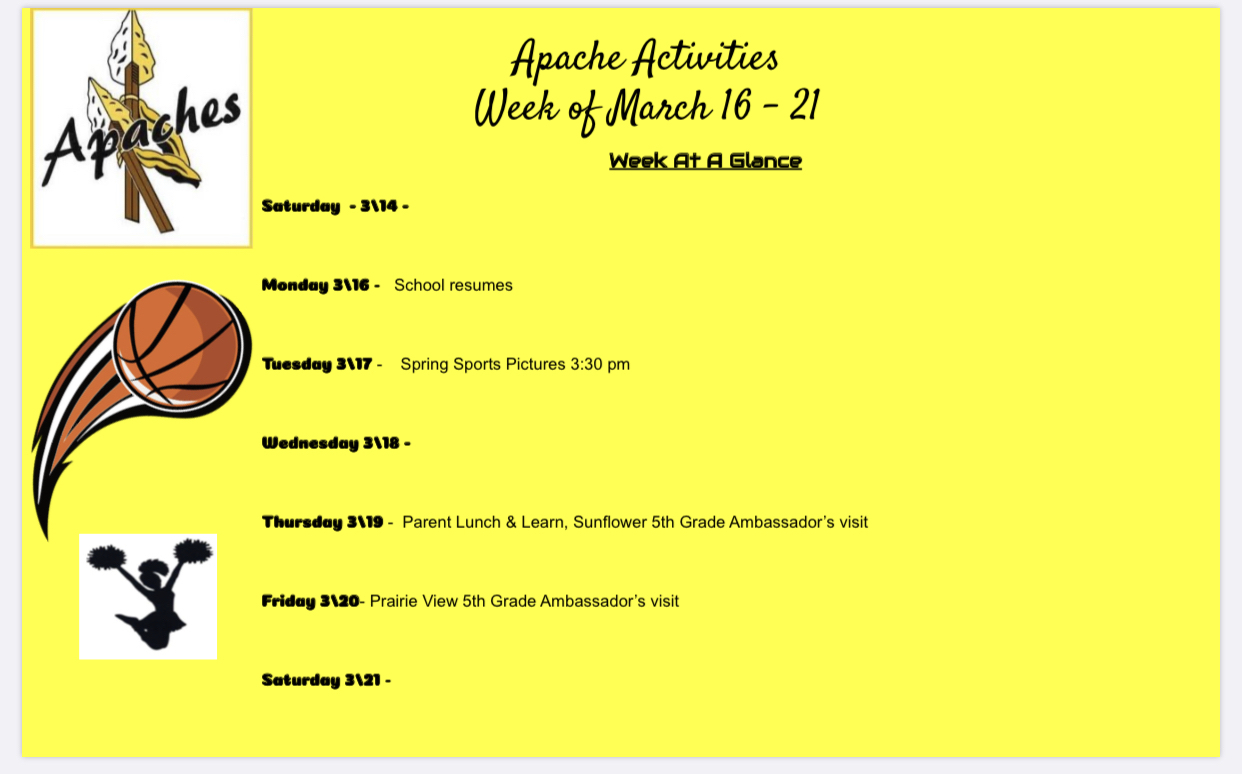 SRMS happenings after Spring Break. Enjoy your break Apaches!! See you again on March 16