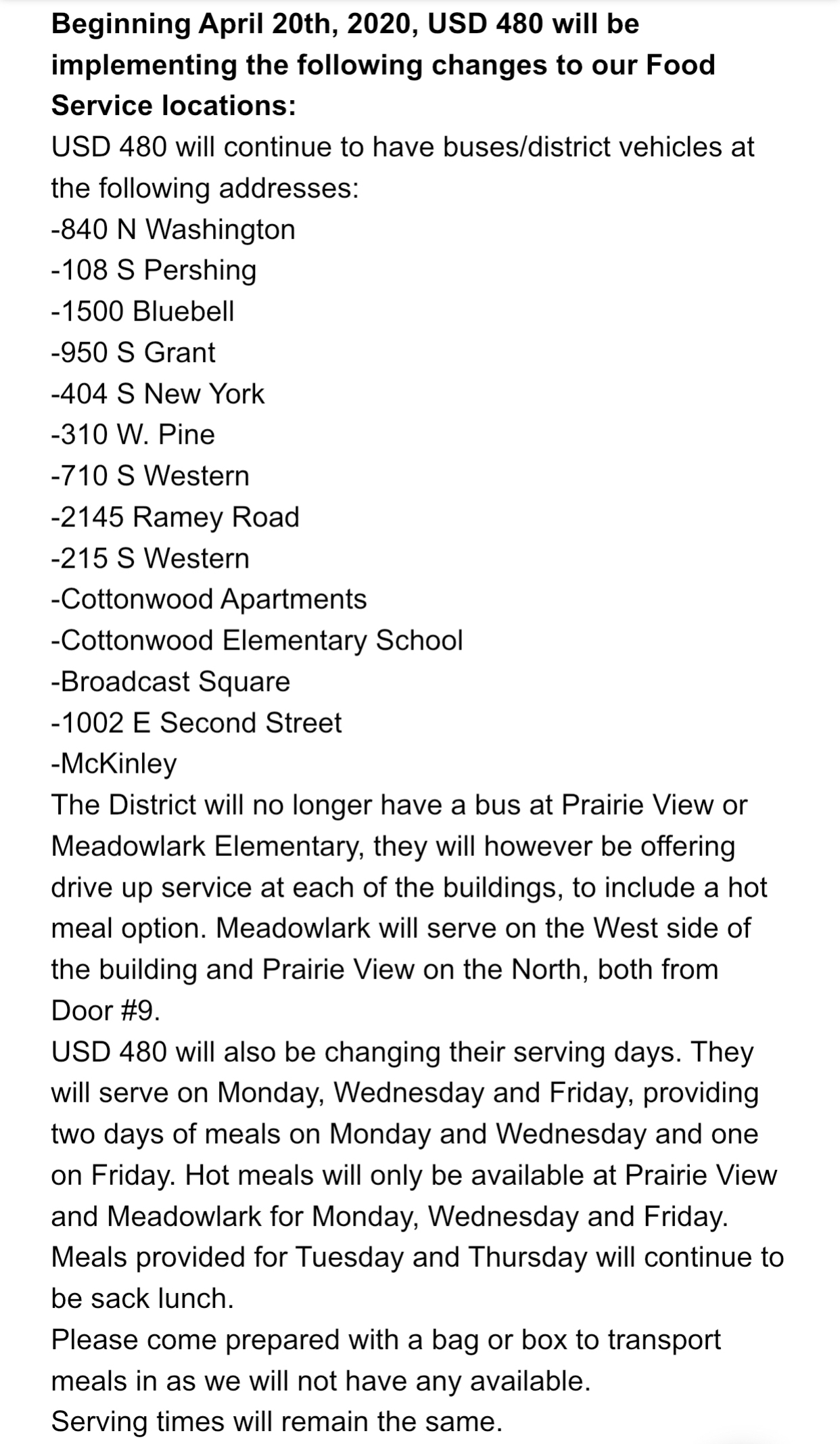 USD480 Meal Schedule changes
